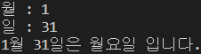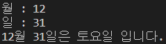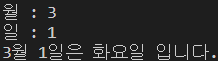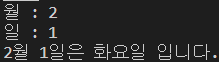 print(f"{month}월 {day}일은 {what_day[n]}요일 입니다.")